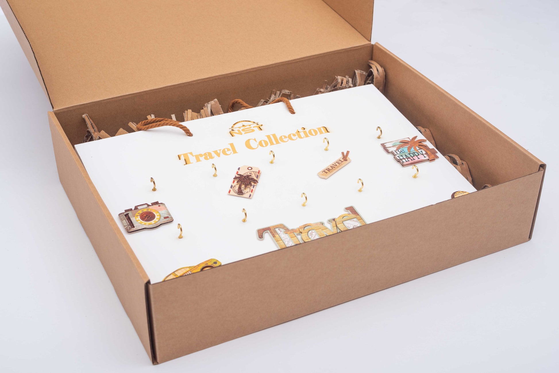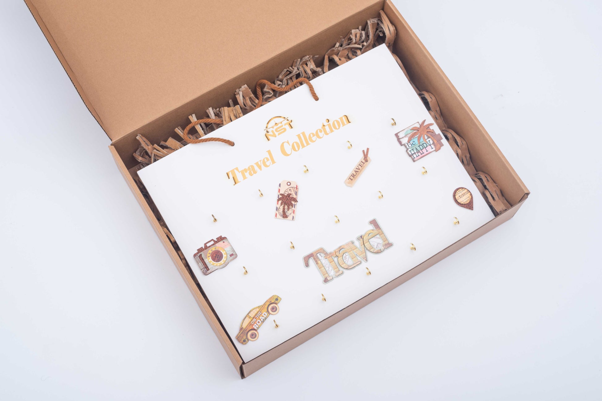 Diseñado para sostener al menos 15 llaveros con sus ganchos resistentes, el tablero está elaborado con material duradero y presenta un intrincado diseño grabado con láser, complementado con calcomanías 3D con temas de viajes. La estética rústica, con colores similares a la madera y motivos de viaje, inspira una sensación de aventura y pasión por los viajes. El tablero se cuelga fácilmente en la pared con una cuerda resistente, lo que lo convierte en un encantador complemento para cualquier espacio.