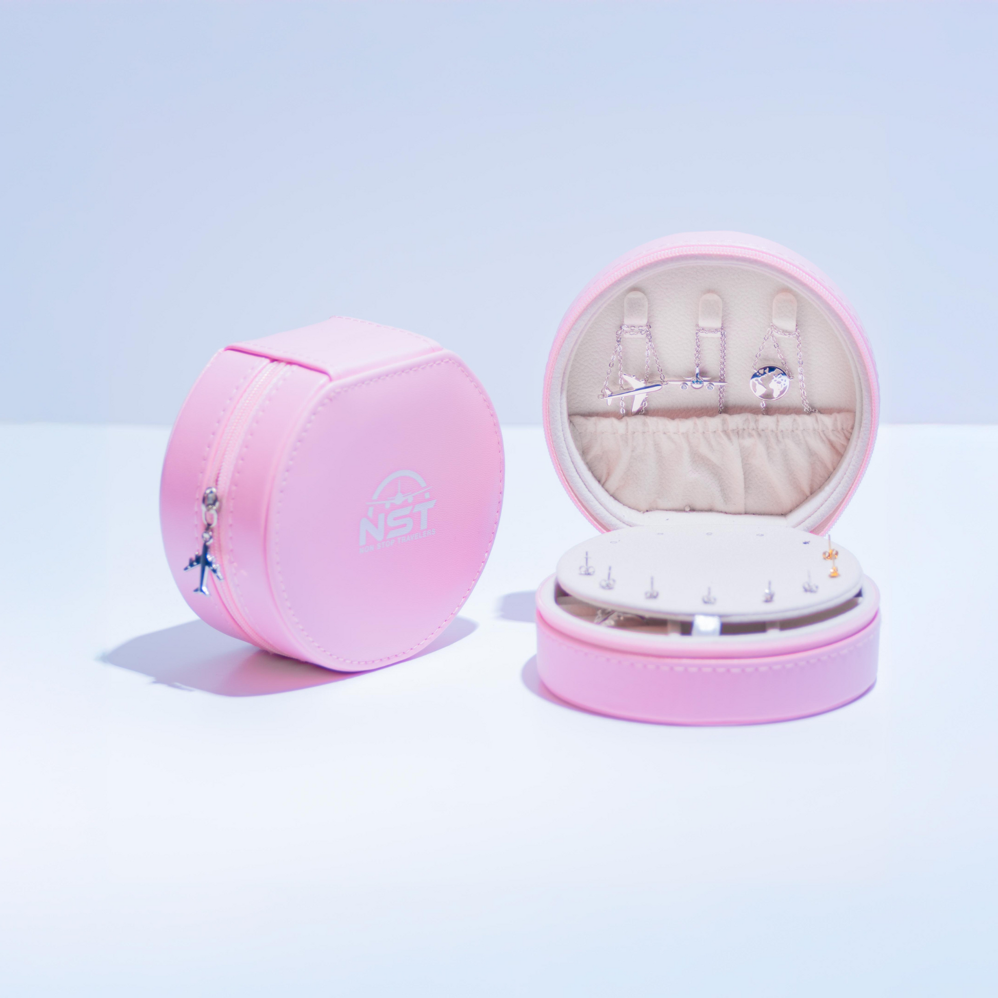 Introducing our Non Stop pink Jewelry Organizer, the ultimate travel essential for the modern adventurer. Its sleek, round design in elegant pink exudes sophistication, while the charming airplane charm hanging delicately captures the essence of adventure and exploration.